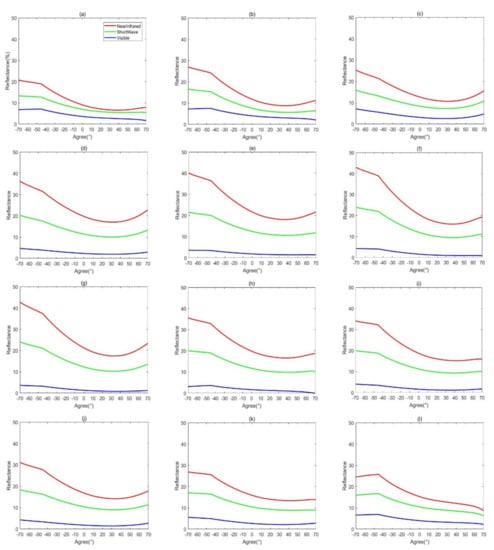 The BRDF principal planes in three broad bands (NIR, SW and VIS) show that the BRDF’s shape gradually changed from January to December (Figure 7). We evaluated the representativeness of PAV and AEV based on the BRDF shapes at monthly steps in three broad bands at each selected site.