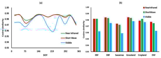 The representativeness of PAV (Equation (16)) in three broad bands (NIR, SW and VIS) is 0.984, 0.983 and 0.975, on average, for the DBF site (Figure 8a). Figure 8b shows the statistics of the representativeness for six selected sites, while the average representativeness of PAV in the NIR, SW and VIS band is 0.980, 0.979 and 0.969, respectively. Thus, the six-component PAV has high representativeness for original BRDF in the NIR, SW and VIS band.