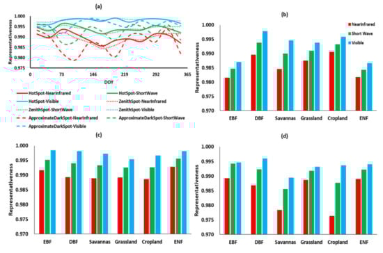 The representativeness of the hot spot, zenith spot and approximate dark spot component (Equation (26)) in AEV within three broadbands (NIR, SW, VIS) is 0.989, 0.993 and 0.997, on average, for the DBF site (Figure 9a). Figure 9b–d shows the statistics of the representativeness of the components in AEV for six selected study sites. The average representativeness of the hot spot, zenith spot and approximate dark spot component is 0.987, 0.991 and 0.994 in the NIR, SW and VIS band for the six study sites. Thus, the representativeness of AEV is also high in three broadbands.