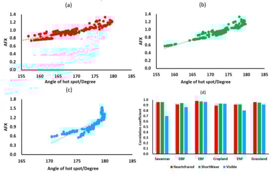 Statistics of the correlation between the hot spot component in AEV and AFX. (a–c) the statistics for the DBF site in NIR, SW, VIS bands, respectively; the dotted line is the trend line. (d) The statistic of correlation for the six selected study sites.
