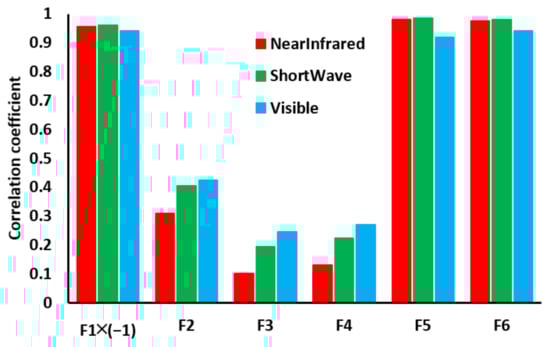 The average correlation coefficient between the six components of PAV and AFX in the three broadbands (NIR, SW, VIS) is −0.953, 0.380, 0.181, 0.209, 0.961 and 0.966, respectively (Figure 11). The correlation coefficients of F1, F5 and F6 in the forward and backward edge regions of BRDF are significantly higher than those in F3 and F4 near the zenith. This indicates that the components of F1, F5 and F6 in PAV show higher correlation with the weight of scattering effects and have potentiality to capture the weight of scattering effects.
