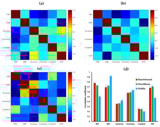The statistics of the correlation of hot spot components in AEV for the study sites. (a–c) The correlation for pixels with various types in NIR, SW and VIS band, respectively; (d) the statistic of the correlation for pixels with the same types.