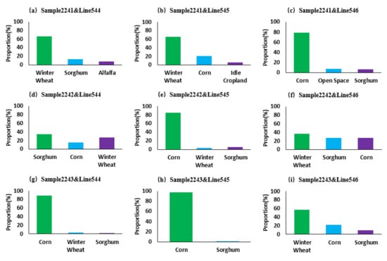 The proportion of categories in MODIS pixels (500 m) for cropland site and the adjacent pixels based on CDL (first three categories). (a–i) the sample and line is the location of MODIS pixel in the Tile image.