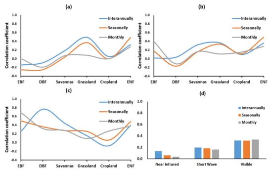 Statistics of correlation coefficients between hot spot component in AEV and NDVI. (a–c) The correlation curves of the three temporal scales for the selected sites in NIR, SW and VIS band, respectively; (d) the average correlation coefficients between BRDF’s shape and NDVI for the six selected sites at three temporal scales of annual, seasonal, monthly phases in NIR, SW and VIS band.