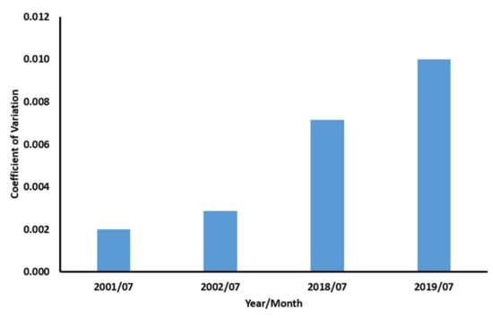 The coefficients of variations for hot spot components in July 2001 and 2002 are lower (0.0020 and 0.0028) (Figure 15). This indicates that the variations of BRDFs before land reclamation and without vegetation are relatively lower. The coefficients of variations for hot spot components are significantly higher in 2018 and 2019 (0.0071 and 0.0099), which indicates that the variations of BRDFs are relatively higher after land reclamation due to the influence of vegetation. Thus, BRDF shape vectors have the potentiality to monitor the land cover in mining area.