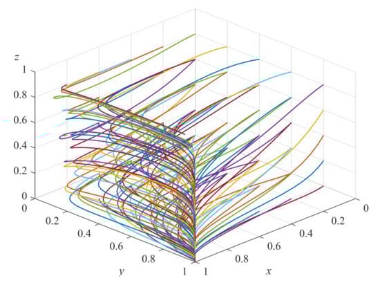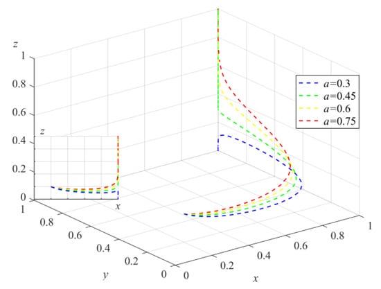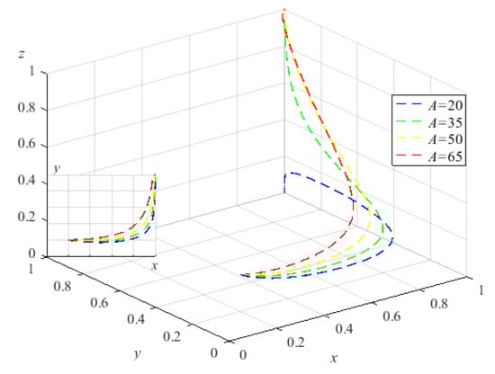 Because , with the increase of , , and , or the decrease of and , will decrease, the stable cross-section in Figure 3a shifts down and leads to the volume of in Figure 3c to become larger, that is, the probability of the retailer participating in emergency collaboration increases. Because the stable point in the space is , the probability that the retailer participating in emergency collaboration will tend to 1, which is proved. ☐