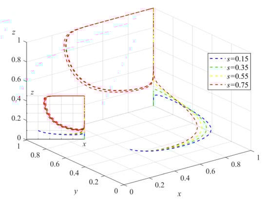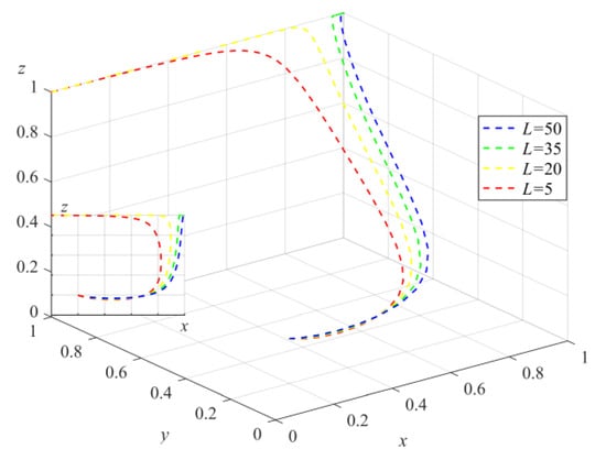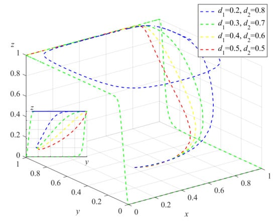 Although supply chain enterprises have higher benefits from participating in emergency collaboration and lower emergency risks the more supply chain enterprises can spontaneously participate in emergency collaboration, the distribution of collaboration benefits is also worthy of in-depth discussion. Because the retailer encourages the supplier to collaborate, we think the retailer will be more willing to allow the supplier to obtain more revenue share. In this case, we set up four cases of the retailer’s and the supplier’s benefit distribution rate, such as , ,, and , and the evolution results are shown in Figure 12. It can be seen that in the two cases with a large difference in benefit distribution, such as and , the system evolution is very unstable, and the retailer and the supplier cannot form a stable state of spontaneous emergency collaboration. However, in the two cases where the difference between the two benefit distributions is insignificant, such as and , the system can reach (0,1,1), and the system evolves to the strategic combination at the fastest rate when the collaboration benefit is equally distributed.