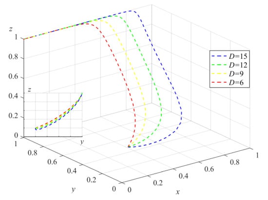 When the initial strategy choice of the retailer is within , as shown in Figure 3b, , that is, when , is the stable point, at that time the retailer will choose the non-collaboration strategy. Therefore, when the probability of government supervision is relatively small, that is, the intensities of subsidizing the retailer’s emergency collaboration behavior and punishing non-collaboration behavior are relatively small, the retailer will perceive that the benefits of participating in collaboration are small so that the retailer will not implement the emergency collaboration strategy.