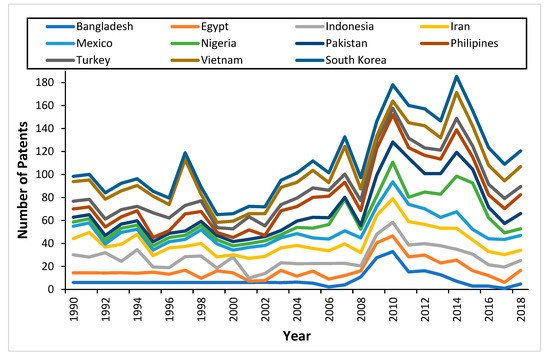 Today, the world is facing drastic environmental problems and no country is being spared from the associated changes. Several studies have documented that unsustainable consumption represents the main driver of climate change [1,2]. Unsustainable consumption is not astonishing for developing countries. Developed countries are also facing climatic problems. The demand for food, water, and energy is increasing, due to which biocapacity is decreasing in these countries [3,4]. Besides that, N-11 countries are among those countries whose ecological deficit is rising continuously. Therefore, it is important to measure the factors of ecological deficit in these nations because they are contributing to the world’s economic development. To deal with environmental problems, N-11 countries have established many environmental regulations. Figure 1 shows the trends of patents on environmental technologies in N-11 nations. The number of patents shows the research and development in a particular country. This activity can be enhanced if the quality of education is good and equal opportunities are provided to all citizens. The trend of patents is almost changing similarly in these countries, but the number of patents can be varied due to the diverse economic growth and population growth.