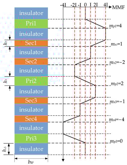 In Dowell’s equation, the magnetic field is assumed to be parallel to the winding layer, which means the one-dimensional flux distribution, and is very suitable for magnetic field distribution in planar magnetics [36]. Further, the coefficient is used to compensate the magnetic field distortion in the high-frequency range.