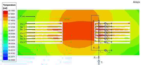 Thermodynamic models of different components of planar transformers have been established in the past. In [10], based on the principle of fluid mechanics, the thermal characteristics of PCB are modeled by the finite volume method. The maximum connection temperature, the thermal distribution and the influence of different ambient temperatures on the thermal characteristics of PCB are obtained. As described in [11], a new SPICE ferroelectric–thermal model of ferromagnetic core is given, and the calculation methods for the relevant magnetic parameters, geometric parameters, and thermal parameters are introduced. On this basis, an inverse thermal model based on the temperature rise of the transformer core is proposed to determine core loss [12]. For this purpose, PCB with thermal sensors is initially used to measure temperature rises, whereas these models in [10,11,12] lack comprehensive comparison, and different winding structures will lead to different power loss distributions inside. In order to predict the temperature distribution of each component and provide the basis for high reliability, the thermal network modeling of planar transformers is essential [13]. The analysis of temperature modeling requires knowledge of transformer structures, power loss models and temperature points of interest [14,15]. In [16], a thermal model of the transformer considering multi-physics coupling is proposed. It can improve the accuracy of the hotspot temperature calculation but with a significant increase in model complexity. A steady-state thermal network model is proposed on an underwater ring transformer [17]. This model is more straightforward than the finite element thermal simulation model and shows acceptable error, but the application range of the model is limited in underwater scenarios.