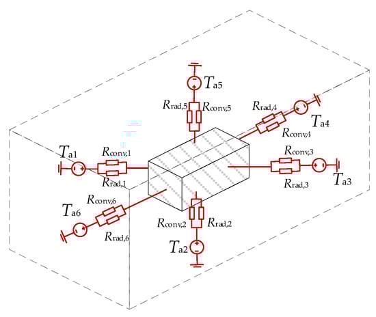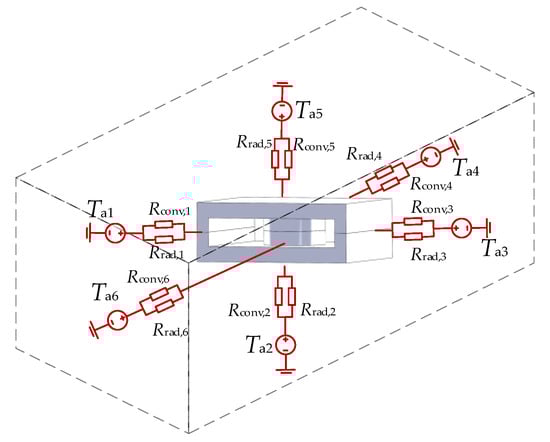The radiation thermal resistance of each part is obtained in Equation (6). Assuming the Ta, Ts and are consistent in all directions due to the small volume of the transformer, all thermal radiation resistances are equivalent to parallel connection. Similarly, the thermal convection resistance of each part can be obtained in Equation (7) where Nu is also a constant. The total thermal radiation resistance and convective thermal resistance are: