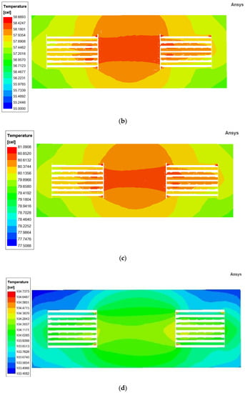 The thermal simulations of the original planar transformer model: (a) the result of setting the ambient temperature to 23.4 °C with gravity; (b) the result of considering the radiation of windings with gravity; (c) the result of setting the ambient temperature to 50 °C with gravity, (d) the result of setting the ambient temperature to 50 °C without gravity.