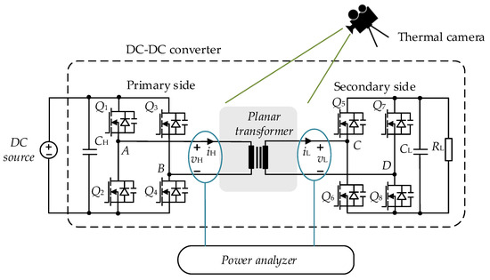 Experimental measurements are carried out on the MHz prototype to compare with thermal simulation and theoretical calculation and verify the simplified model [15,16]. The experimental configuration is shown in Figure 11, and the testing bench is shown in Figure 12. The planar transformer is excited by a DC-DC converter with two full bridges to emulate the 1 MHz rectangle waveform voltage excitation in operation scenarios. Q1, Q2, Q8 are the semiconductor switches, CH, CL, and RL are input and output DC link capacitors and output load, respectively. The input current and voltage iH, vH, and output current and voltage iL, vL of the transformer are measured with the power analyzer Newtons4th PPA5500. The core loss is tested when the output side full bridge is open-circuited, and the core loss Pcore is calculated by: