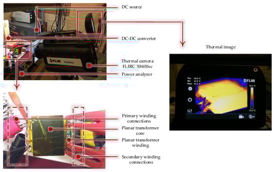 The winding loss is obtained by subtracting the full load loss from the core loss. The thermal camera FLIR X8400sc is used to obtain the thermal image and the temperature rise of the planar transformer.