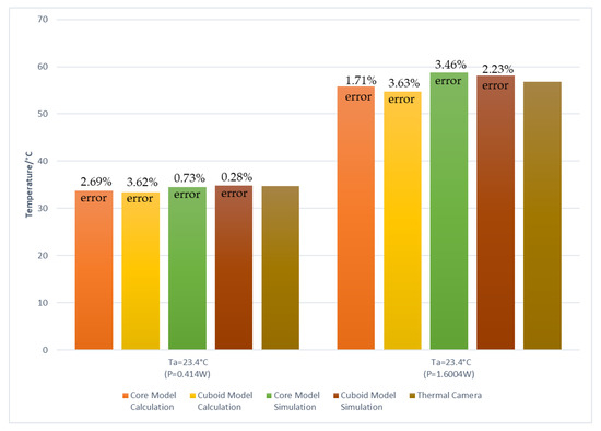 When the total loss is 0.414 W, the maximum temperature of the planar transformer measured by the thermal camera is 34.7 °C. In this case, the error label in the bar in Figure 13 is the error of temperature rise obtained by different methods compared with the thermal camera. The thermal simulation error with the simplified model is very small, about 0.28%. However, due to the low thermal radiation coefficient of the windings in the real object, the actual thermal resistance will be higher than the calculated thermal resistance, so the measured temperature rise of the prototype is slightly higher than that calculated. It can be seen that the errors of the two thermal simulation models are relatively small, and the cuboid model can also ensure more accurate results at high temperature, with an error of about 2.23%. The discrete magnetic core model can also approximately simulate the temperature rise of the real planar transformer, but because the contact area with the air is larger than the actual area, the temperature rise is slightly lower than the actual temperature rise, and the error is about 3.46% when the ambient temperature is 23.4 °C. Overall, the analytical calculation, thermal simulation, and experimental measurements agree well with each other, and the error is neglectable, which verifies the proposed simplification model in this paper.