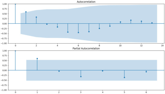 where denotes the series of after d difference transformations, and denotes the EWP at time t. denotes the random errors at time t, which are mutually independent white noise series and obey a normal distribution with mean 0 and variance constant . and are the parameters to be estimated, whose orders are p and q. In conclusion, the above model is denoted as ARIMA(p,d,q).