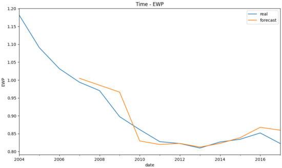 Before applying ARIMA(2,3,2) for prediction, Figure 4 compares the actual curve of EWP and the curve forecasted by the model. We can see a small gap between the actual value and projected value (Table 7), which proves the great accuracy. In addition, the accuracy of the trend is more important than the value. The slopes of the actual curve before 2013 are always negative. Moreover, the changing pattern is a high slope in one period and low pitch in the next. The design is in line with the results in Table 3, which indicates that the coefficients of EWP lagged by one and two periods are positive and negative. The slopes of the forecasted curve are similar to the slopes of the actual curve, except the slope from 2011 to 2012, which is positive. However, the overall trends are identical. The points of 2013 are almost overlapping. After 2013, both slopes are positive. In addition, both curves reach a peak in 2016, corresponding to the previous conclusion.