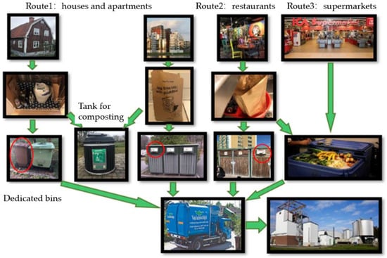 All food waste generated in Västerås city is collected and transported by one company (Vafab). According to interviews, 8879 tons of food waste was collected within the Västerås city boundary in 2017, which is the basis for further calculation in this study. Therefore, the food waste separation rate in Västerås is 65% (i.e., 8879/13662), which is very high compared with the rest of the world [10]. The remaining part of the food waste is mixed into the “other” category and sent to Mälaenergi Combined Heat and Power (CHP) plant, or in some cases, self-composted. The whole process is facilitated by a sound and effective food waste collection and transportation system, the logistic flow of which is shown below in Figure 3.