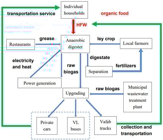 All these factors must be considered for the conversion of HFW (and other organic waste) to renewable energy and materials, whose success requires systematic support from an integrated framework of energy and environmental strategy, policymaking, financing, regulation, technology, and market development. At the root of all these factors are social awareness, consensus, and active participation. Perhaps due to the complex and multi-disciplinary nature of such projects, successful long-term, large-scale HFW-to-biogas cases are rare worldwide, and relevant reports are seldom seen in the scientific literature [9,10]. Existing research in this field tends to cover single aspects, such as waste separation behavior [10], energy potential [5], process efficiency [4], emission reduction and environmental impact [6], economic analysis [2], and general policy structures [3], while the full scope of an HFW-to-biogas practice has not been extensively studied. To fill this knowledge gap, this study presents a detailed and comprehensive analysis of the real-life case of Västerås, a medium-size industrial/manufacturing city in southern Sweden that has been operating a centralized biogas plant since 2005, continuously and efficiently converting the city’s HFW and other organic wastes into high-quality biomethane and biofertilizer, which are then utilized by the local public transportation service and farming sector, respectively [11]. This plant has been mentioned in a few previous studies, but their focus was mainly on various technical issues [12,13]. In this study, the mechanism underlying the successful HFW-to-biogas scheme of Västerås was explored in a systematic and integrated way. With first-hand data and materials, various aspects including its technological features, energy potential, environmental benefits, economic viability, and public participation were surveyed to illustrate the material, value, and information circulation throughout this process. This study will provide insights into how an HFW-to-biogas project achieves long-term sustainability and multiple benefits in certain social settings. More importantly, it can serve as a model for similar future projects and offer a complete analytical framework for the factors relevant to their success or failure.