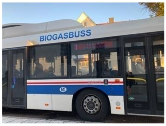 The total quantity of raw biogas generated from Västerås city’s HFW was calculated to be 8879 tons * e = 887,900 Nm3 (65% CH4) in 2017. When upgraded into vehicle-grade biofuel (97–98% CH4, 97.5% used for calculation), the energy potential was 590,000 Nm3 (as biomethane, see Equation (2)). This biomethane is provided as a commercial vehicle fuel to consumers around the city, with the major user being the local public transportation provider VL. According to the data supplied by VL, there are 73 biogas-powered buses running within the Västerås city boundary, with an average mileage of 186 km per bus per workday. The consumption rate of biogas by the buses is 57 Nm3/100 km. Therefore, the total mileage that can be sustained by Västerås’ HFW is 3981 km/day (assuming 260 workdays per year), which can sustain 21 biogas-powered buses in their daily operation. Hence, the biogas from Västerås’ HFW alone can support over 29% of the city’s public transportation. On the other hand, if the total biomethane production (2,890,000 Nm3) is used as the base of calculation, a fleet of 105 buses could be run exclusively on renewable sources, such as HFW, commercial food waste, ley crop, sewage sludge, and animal manure.