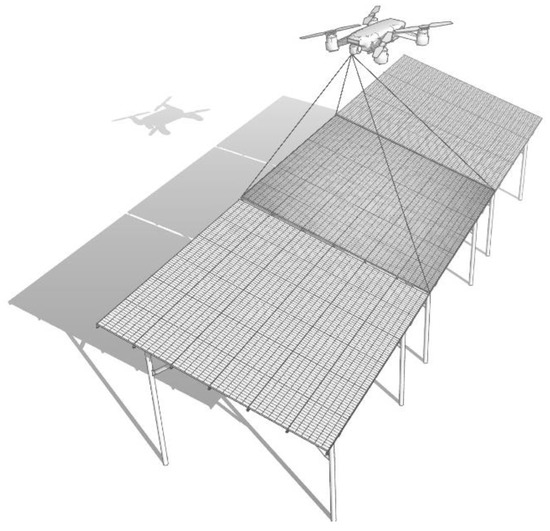 (1). Thermographic method. The method is based on a neural network analysis of data obtained when shooting modules using an infrared camera attached to a UAV [27,28,29]. A method designed to search essentially overheated sections (hot spots) of photovoltaic modules that occur due to an increase in the resistance of modules due to their prolonged shading. The advantages of this method include the possibility of its use at any solar power plant, without performing preparatory work related to changing the design solutions of the station and installing additional sensors. However, the use of this solution is complicated by the slow process of capturing objects of interest with an infrared camera. In view of this, in order to obtain correct data, it is required to significantly limit the UAV flight speed. Furthermore, this solution is ineffective for promptly responding to problems that have arisen, due to the need to “manually” determine the location of the problematic object, as well as the impossibility of accurately determining the cause of the hot spot.