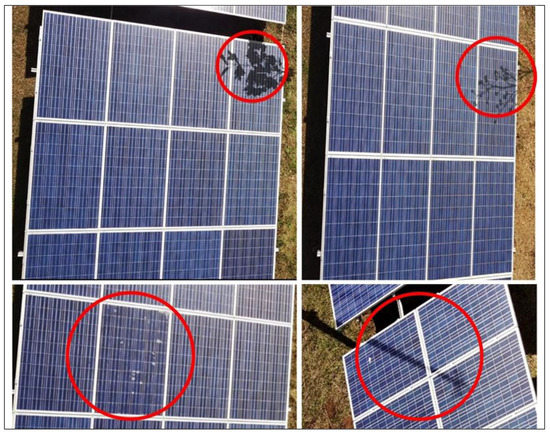 An analysis of the efficiency of performing neural network detection procedures depending on video recording modes showed that the optimal video recording parameters are a 1080p resolution with a frame rate of 30 FPS. This mode of video recording makes it possible to significantly speed up the processing of data by the neural network without reducing the quality of detection and increasing the power consumption of the UAV video camera. As a result of test flights and the video recording of the modules, it was possible to create a training set of more than 500 images (Figure 3). The training sample contains images of normal, shaded, and damaged modules, which is necessary to increase the quality of detection and minimize the number of false positives.