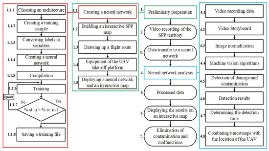 Thus, the creation of an automated complex is a multi-stage process, the general structure of which can be represented as a block diagram (Figure 4). The principle of its operation lies in the neural network analysis of video files captured by a UAV moving along the flight route above the photovoltaic modules. All captured data is analyzed to detect shading and damage to photovoltaic modules, which are then displayed on an interactive SPP map.