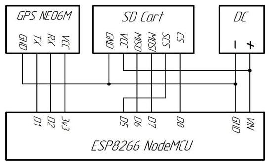 ESP8266 is used as the main microcontroller. To obtain geospatial information, the measuring module has a GPS receiver based on the NEO-6M-0-001 chip based on the Ublox NEO-6M STM chip. This module is a stand-alone GPS device with a high-performance u-blox 6 positioning processor. To communicate with the microcontroller, a UART (TTL) interface is used with a supported baud rate from 4800 to 230,400 baud, 9600 baud by default. Geotagged log is recorded on a micro-SD memory card. For this, a specialized micro SD card module is used, which is connected to the microcontroller via the SPI interface.