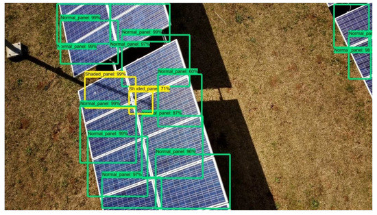 The next step after creating the training sample is its markup. The image labeling procedure is required to convert the sample data (images) into variables “understandable” for the neural network, which it can process and generalize [54]. For markup (annotation), the LabelImg (https://github.com/heartexlabs/labelImg, accessed on 28 August 2022) tool was used. Images of the training sample were manually labeled into two classes: “Normal_panel” and “Shaded_panel”. The first class includes images of photovoltaic modules with a normal (unshaded, clean, undamaged) surface. The second class includes images with problematic (shaded, dirty, damaged) photovoltaic modules.