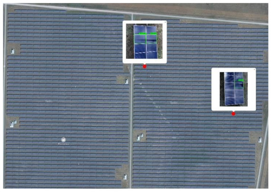 The results of the neural network processing of video materials obtained using the UAV camera are shown in Figure 6. Problem areas detected by the neural network on the surface of photovoltaic modules are visualized on the SPP interactive map (Figure 7).