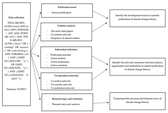 For the data collection, specific keywords and suitable operator method by syntax were used to find the related articles of climate change literacy. SCOPUS (http://www.scopus.com/) (accessed on 29 August 2022) was used to search the scientific literature and identify the related publication data for analysis. The searches were extended from 2001 to 2021 and conducted in the second week of April 2022.