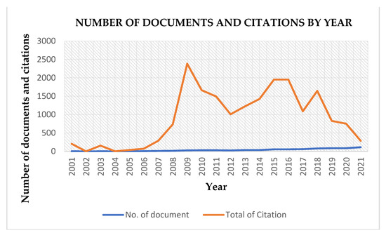 The aim of exploring publication and citation trends is to determine the developmental patterns of a specific topic research in certain years. Hence, Figure 1 shows the growth of publication and citation numbers in climate change literacy from 2001 to 2021.