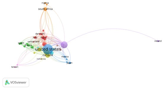 The co-authorship network between countries. The visualization generated by VOSViewer software.