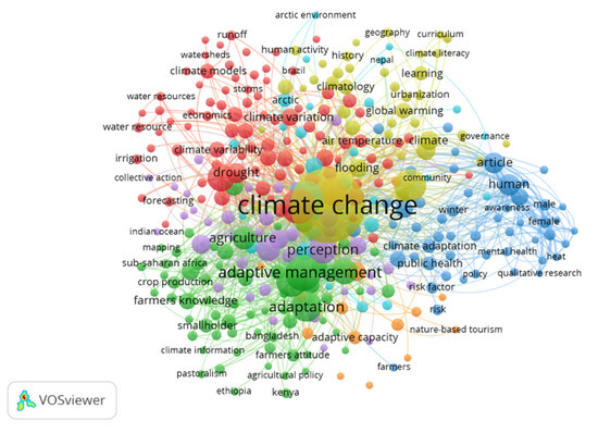 When analyzing the journals, most were found to be highly ranked: Q1 to Q4 in the journal rankings of SCOPUS. In addition, most of these journals (Table 4) were highly ranked in SCOPUS. From the analysis, five journals were ranked Q1, four journals were ranked Q2 and only one journal ranked Q3. For instance, the journal Weather, Climate and Society was found to be the most influential journal in publishing the interactions of weather and climate with society-related research. Therefore, it can be concluded that these journals are highly relevant in regard to the research topic and include high-quality research based on their impact (Journal Impact Factor) over the last two decades [26]. In terms of CiteScore rank, Global Environmental Change has the highest indicators, with a 3.26 rating, followed by Wiley Interdisciplinary Reviews—Climate Change (1.38 rating), and Weather and Climate Extremes (1.27 rating). It can be concluded that the highest rating CiteScore is ranked in the rank Q1.