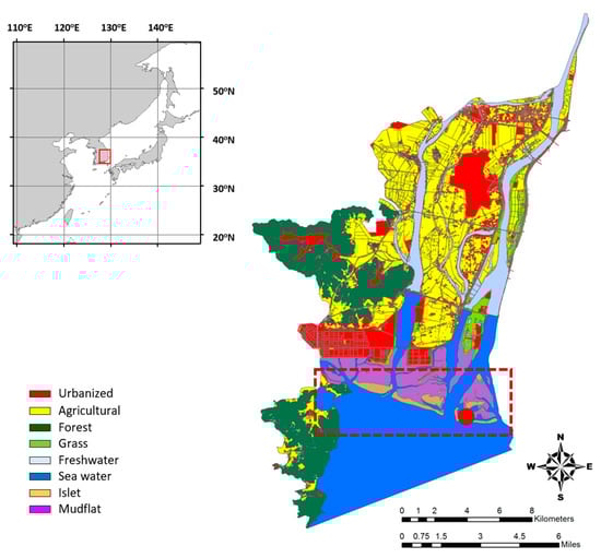 Nakdong Estuary is located in southeast South Korea (35°05′ N, 128°55′ E; Figure 1) and provides important habitat for migratory birds in the Australasian Flyway. A variety of avian species utilize the estuarine area as their breeding or stopover site [17,18]. Annually, more than 200,000 individuals belonging to approximately 300 species of birds are found in the estuary, and the dominant species is the Mallard, Anas platyrhynchos (Linnaeus, 1758). The value of the estuary can be determined by the distribution of endangered species that are designated on the IUCN Red List [13].