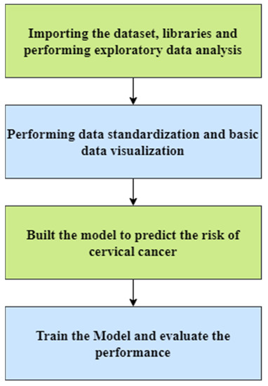 The authors in [27] tried to utilize machine learning algorithms to figure out whether the patient has cancer based on a variety of characteristics in the dataset. Cervical cancer can be detected sooner if the existence of the disease can be predicted. Considering various prominent machine learning classifiers, the authors of [28] found that the random forest fared the best. Moreover, the suggested cervical cancer forecasting model outperformed previously published cervical cancer prediction models [29,30,31,32,33,34,35]. Furthermore, a software device is being designed that may gather cervical cancer potential risk data and which provides findings from a cervical cancer forecasting model for immediate and correct intervention at the early stages of cervical cancer [23,36,37,38,39,40,41,42,43,44,45]. Our proposed model worked on a deep learning model supported by the XGBoost algorithm and offered the second-best performance among the various existing frameworks in the same domain.