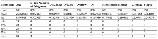 - Cervical Cancer. DataHub. 2020. Available online: https://www.datahub.io/machine-learning/cervical-cancer (accessed on 19 September 2022).
