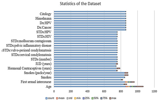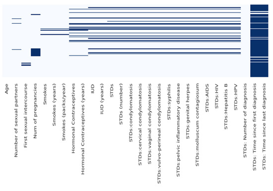 Before performing further analysis, the missing values are replaced with NaN. After that, the heatmap of the entire dataset is plotted in Figure 3. All these values are linked, have, or play a key role in developing cancer. The intrauterine device (IUD) is primarily used for birth control, and there are also hormonal contraceptives, which again are used as hormones for birth control, and these two features are included if the patient is using hormonal contraceptives, including how many years they have been using these birth control strategies. There are also various types of STDs included. This study explores these features so to forecast the risk of cervical cancer. Depending on the examination, patients should be able to know if there is cancer or not. Another strategy or test that could be used for diagnosis is called the Schiller test, which is where, in Mayadeen, cervical cancer cells are detected. The third type of test is called cytology and psychology, performing an exam of a single cell-type, and which is primarily used for cancer screening. Finally, the most accurate is the biopsy, which is performed by removing a piece of tissue and examining that tissue under a microscope. The mean value of the dataset is calculated using the formula in Equation (2), as given below: