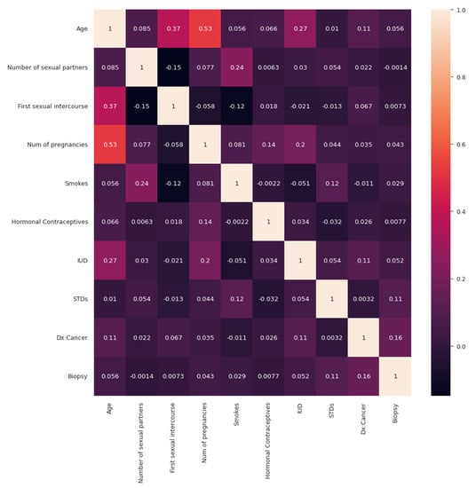 - Parikh, D.; Menon, V. Machine Learning Applied to Cervical Cancer Data. Int. J. Math. Sci. Comput. 2019, 5, 53–64. [Google Scholar] [CrossRef]
