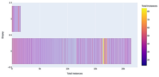 Broadly said, a correlation matrix is a table that shows the correlation coefficients for various variables. The correlation between all potential pairings of values in a table is shown in the matrix. It is an effective tool for compiling a sizable dataset and for locating and displaying data patterns. After visualizing the correlation matrix, the number of biopsy instances and the total number of instances of the biopsy is visualized, as shown in in Figure 6.