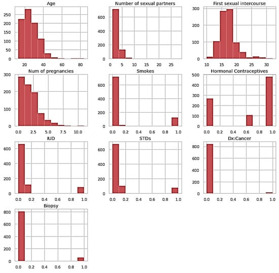 Before building the model, the authors drop the missing values. There are columns in the dataset, such as STDs and the time since the first and last diagnosis, which contain many missing values, so they are dropped. The statistics of the dataset show that there are 858 entries. The various parameters critically affect the risk of cervical cancer, such as age, the number of sexual partners, smoking status and number of packs per year, or if there is an STD or not. Some columns in the dataset are of the object type; therefore, we have converted them into numeric values for better understanding and computation. Figure 4 shows the graphical representation of the data.