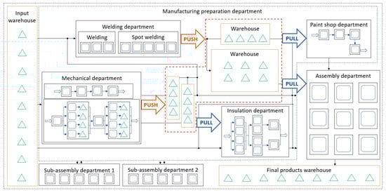 The complexity of the flow analysis is the result of the number of possible planning routes for given production technology, the number of available machines and different types of material flow. In the analysed case, there are two different flow streams: push and pull (Figure 1). Push flows occur in the first stages of material processing; pull flows occur in the next part of the system. The existing dichotomy generates a higher level of work in the production of WIP (WIP—work in progress) but reduces the potential risk of stopping the continuity of the flow of processed materials. Such a situation was developed on the basis of many years of experience. In terms of minimising the level of inventories in the course of production, these activities are financially ineffective. However, in assessing the maximisation of the level of use of the available net time, it is a beneficial solution.