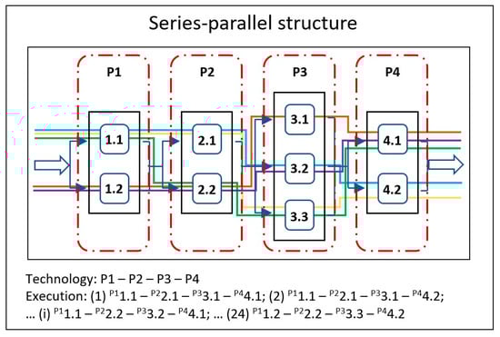 Analyses of the impact of the strategy of maintaining the reliability of machines (reactive, preventive or predictive) on the principles of sustainable development of the enterprise should take into account the number and type of flow streams of the processed material. The number of flow streams of the processed material results from the technical and technological solutions implemented in the company. For the nest organisation of production, the determinant of the number of flow streams of the processed material is the number of possible configurations of the planning route. For a given technological route, with the access of more than one machine implementing a given production process, we can define M different planning routes. Graphic visualisation of the cited case is presented in Figure 2. In Figure 2, subsequent types of manufacturing processes in an example series-parallel structure are marked as P1–P4 and the manufacturing units performing specific manufacturing processes are marked as 1.1–4.2.