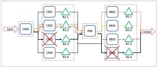 The situation is different in mixed (series-parallel) systems. For parallel objects of technical similarity (sets: {CM1; CM2; CM3; CM4} and {BM1; BM2; BM3; BM4}—Figure 4) failure of one of the machines requires the development of a new production schedule for the other two parallel objects. This example is shown in Figure 4.