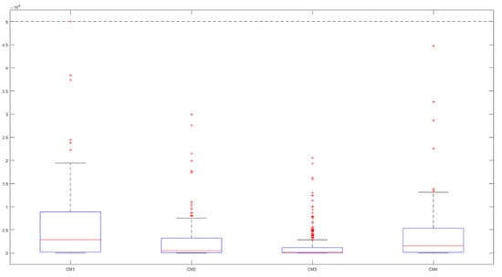 The analyses of the MTTF values and their dispersions against the mean have shown that for the case under consideration, the value of the standard deviation is greater than the average time of correct operation. Only for the BM1 machine is the value of the standard deviation slightly lower than the MTTF value. The visualization of the duration data presented in the form of a boxplot for CM1, CM2, CM3 and CM4 shows the number of outliers beyond 1.5 IQR (Figure 5).