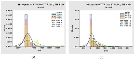 TTF (time to failure) frequency histograms and estimated Gaussian distribution diagram for machines: (a) CMO, CM1, BM3; (b) DM, CM2, CM4.