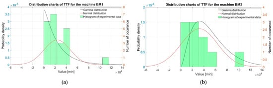TTF (time to failure) frequency histograms and fitted normal and gamma distributions for machines (a) BM1; (b) BM2.