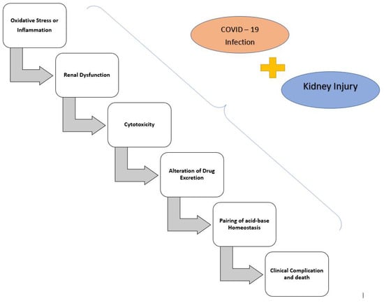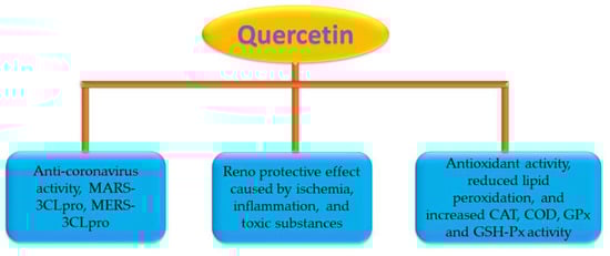 Quercetin is a well-known flavonoid that is available in a broad range of therapeutic plants and nutritional supplements, including oranges, green teas, potatoes, onions, lettuces, and tomatoes. Quercetin is helpful in preventing the activity of coronaviruses which form Middle East respiratory syndrome (MERS-CoV or COVID-19) and severe acute respiratory disorder (SARS-CoV or COVID-19). From various investigations, it was proven that the nephroprotective property of quercetin is effective in contradicting oxidative, obstructive, and inflammatory renal damage in a large spectrum of practical models of AKI. The main mechanism by which quercetin prevents renal damage is anti-inflammatory and antioxidant characteristics [62]. It has been found that quercetin possesses antiviral characteristics in both in vitro and in vivo experiments, especially on various members of the Coronaviridae family. The first report regarding its antiviral property was reported in 1990 where it was found that it diminished the pathogenicity of human and bovine coronaviruses such as NCDCV and OC43 by 50% at a level of 60 µg/mL. The in vivo experiment found that the oral treatment of quercetin exhibited a positive result in immuno-competent rats treated with the Mengo virus. Quercetin also established a concentration-dependent antiviral action towards HSV-1 and HSV-2, herpes simplex virus, in bioreactors. Quercetin prevents many respiratory viruses in cultured cells. Luteolin and quercetin have the capability to inhibit the approach of SARS-CoV or COVID-19 into recipient cells. Quercetin shows great aptitude as a substantial treatment of SARS [63]. Figure 2 explains the process of kidney dysfunction, and Figure 3 explains the components of quercetin positively affecting it.