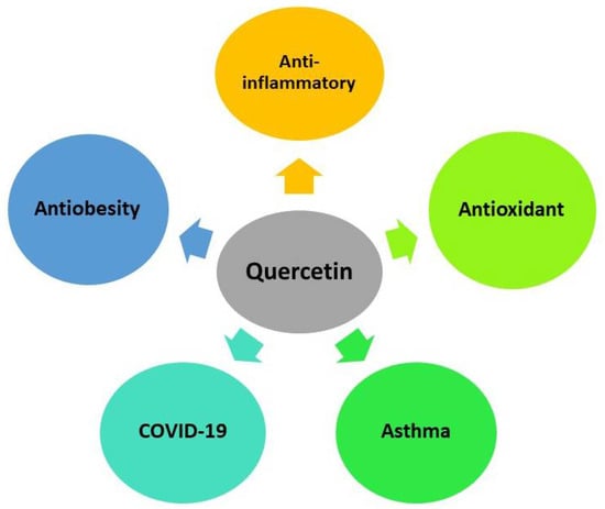 Quercetin is used as an ergogenic substance and thus could reduce postexercise oxidative stress and inflammation, increase endurance performance and immune function, and decline the rate of diseases after vigorous exercise in athletes. However, the majority of the suggested benefits for athletes were not able to be confirmed, despite the fact that orally administered quercetin showed some effects in lowering illness rates and improving exercise capacity in athletes, notably in untrained ones. Quercetin is presently being utilized in conjunction with other bioactive constituents in the pursuit of gaining more stimulating effects, which is of specific importance to athletes. Quercetin as an aglycone is currently recommended as a component of nutritional supplements with a variety of benefits. Despite the fact that the EC has not provided approval for certain health claims, such as DNA protection of proteins and fats from oxidative damage for the general population, quercetin is allowed to be used in “Natural Health Products” in Canada, with two various declarations of health impacts: “an antioxidant” and “utilized in Herbal Medicine as a capillary and blood vessel protective agent” [65]. In western countries, regular quercetin consumption is expected to be 3–40 mg (expressed as aglycone equivalents). The usual consumption of quercetin aglycone that is advised is still between 1000 mg and 2000 mg (usually 500 mg). Therefore, it appears that quercetin consumption in the diet is much lower than quercetin intake via dietary supplementation [66]. A diagrammatic representation of the application of quercetin is shown in Figure 4 [64].